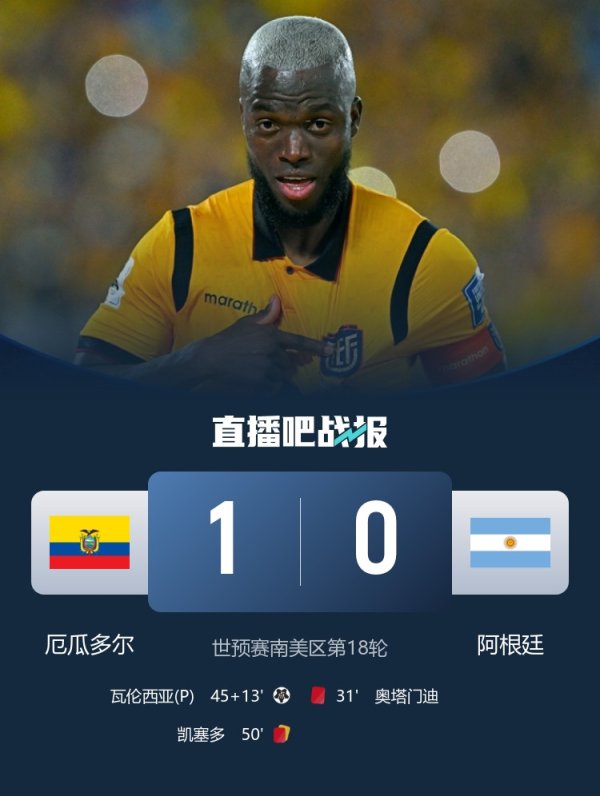 头名收官! 十人阿根廷0-1十人厄瓜多尔 奥塔门迪直红瓦伦西亚制胜直播吧9月10日讯北京时间9月10日7:00,世预赛南美区第18轮阿根廷应战 厄瓜多尔的赛事 在卡尔沃纪念运动活动 场 进行,本场梅西缺阵,上半场瓦伦西亚单刀赴会被大马丁神勇扑出,奥塔门迪直红被罚下,阿根廷0射正,塔利亚菲科送点,瓦伦西亚点射破门,半场结束,十人阿根廷0-1厄瓜多尔。下半场凯塞多两黄一红被罚下足球新闻资讯,最终十
