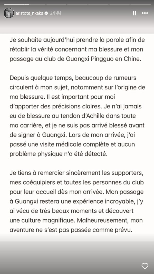 中甲保级队遭外援控诉: 球队不当诊疗导致其跟腱断裂赛季报销!北京时间8月27日,目前中甲职业联赛 正处于间歇期,保级球队广西平果却在准备比赛 关键期遭遇外援控诉,称其因球队的不当诊疗最终导致跟腱完全断裂韩国足球新闻,直接赛季报销。 广西平果外援尼卡卡在个人社交账号上发文称,其跟腱断裂与广西平果的不当诊疗有关。他表示,在加盟之初接受体检时没有任何强健 问题,在苏州参加赛季前的集训时开始出现